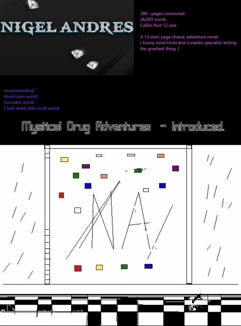 Anxiety/O.C.D./High Functioning Autistic person, presents; "Mystical Drug Adventures - Introduced." with Page Choices. 280 pages connected. Calibri font 12 size. 10/13 starts begun a ways. At least 3 options a page it seems... A 13 start, page choice, adventure novel. ( Funny mind tricks and complex specialist writing the gnarliest thing. ) With so many options. Even the smaller starts will literally be retried and, enduring. If trouble finding pages use the page count. (unlikely for cell phones) works* Business world. Gambling world. Acid (Intro). DMT world. Mushrooms world. (Outstanding) Shopping (Not there). Cannabis world. Kurt C world. Mountain bike suspension jumps (Intro). Crack shack bike stroll world. Theft world. Newspaper World. Driving trip World. ...Main start is the mushroom world... (Only part I repetitively have done work, and, page's a many, maybe to many). recommending* Mushroom world. Cannabis world. Crack shack bike stroll world.